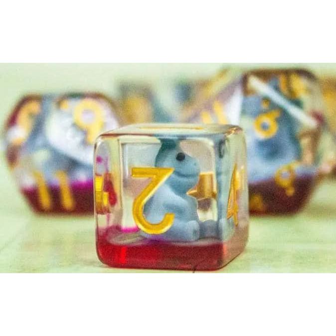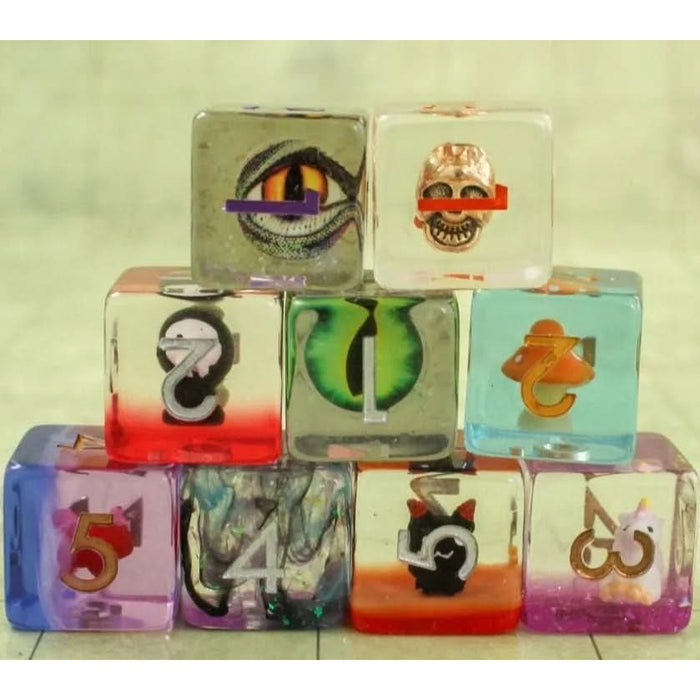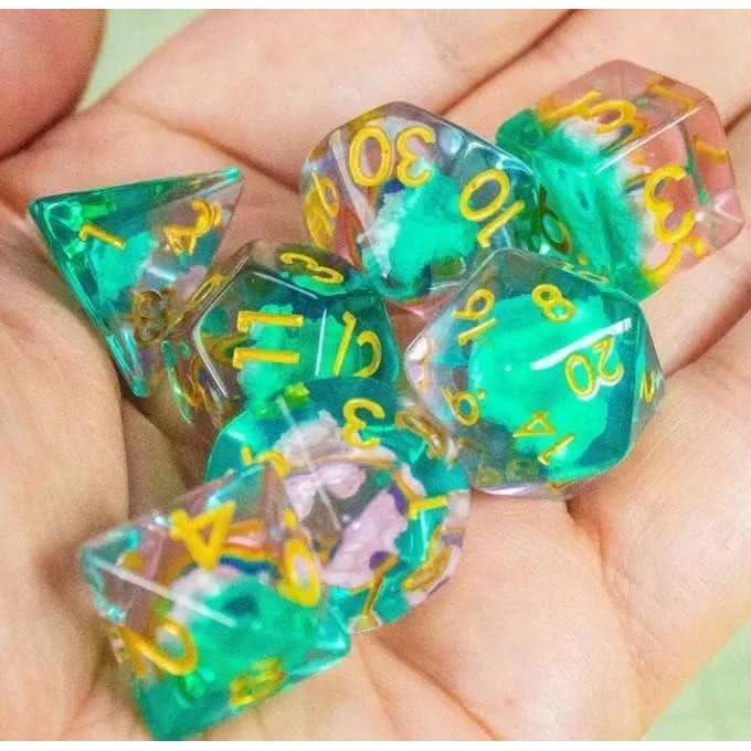 Excellent quality dnd dice!! The perfect Dungeons and Dragons gift. Each bag contains a matching set of inclusion dice from our WIDE collection (form mushrooms, to unicorns all the way to dragon's eyes and little tieflings!)