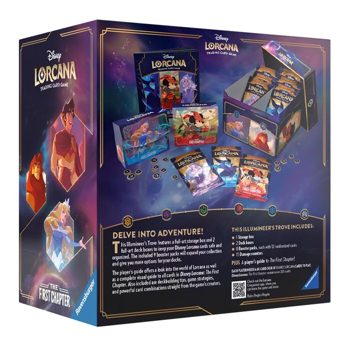 The ultimate treasure for both collectors and players. The Illumineer’s Trove includes a full-art storage box, two deck boxes, eight booster packs, a player’s guide, and more. The player’s guide offers a look into the world of Lorcana as well as a complete visual guide to all cards in Disney Lorcana: The First Chapter. Also included are deckbuilding tips, game strategies, and powerful card combinations from Team Lorcana.