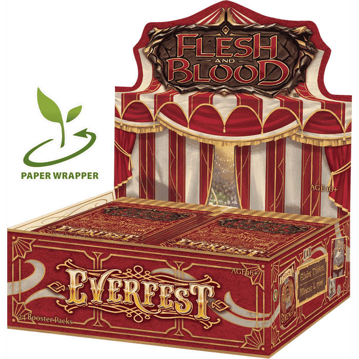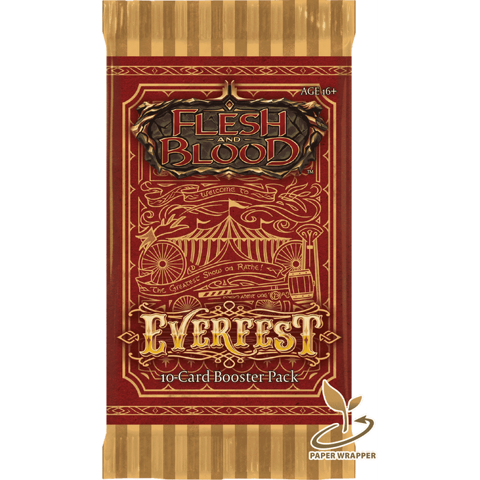 Starting with Everfest first edition, Flesh and Blood booster packs manufactured at Cartamundi Belgium will use paper wrappers whenever possible. We are aiming for all Flesh and Blood boosters to eventually use paper flowwraps, however it will take some time for all our manufacturers to implement this change. As such, fans should expect some future Flesh and Blood booster packs to continue to have plastic flowwraps.